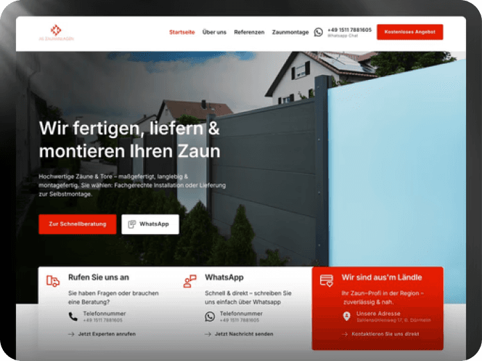 Wir arbeiten ausschließlich mit Handwerksbetrieben rund ums Haus und Grundstück, zum Beispiel Zaunbau, GaLaBau, Dachdecker, Terrassen, Fensterbau und ähnliche Gewerke. Ob dein Gewerk wirklich passt und 20 bis 50 qualifizierte Anfragen pro Monat realistisch sind, klären wir im Erstgespräch.